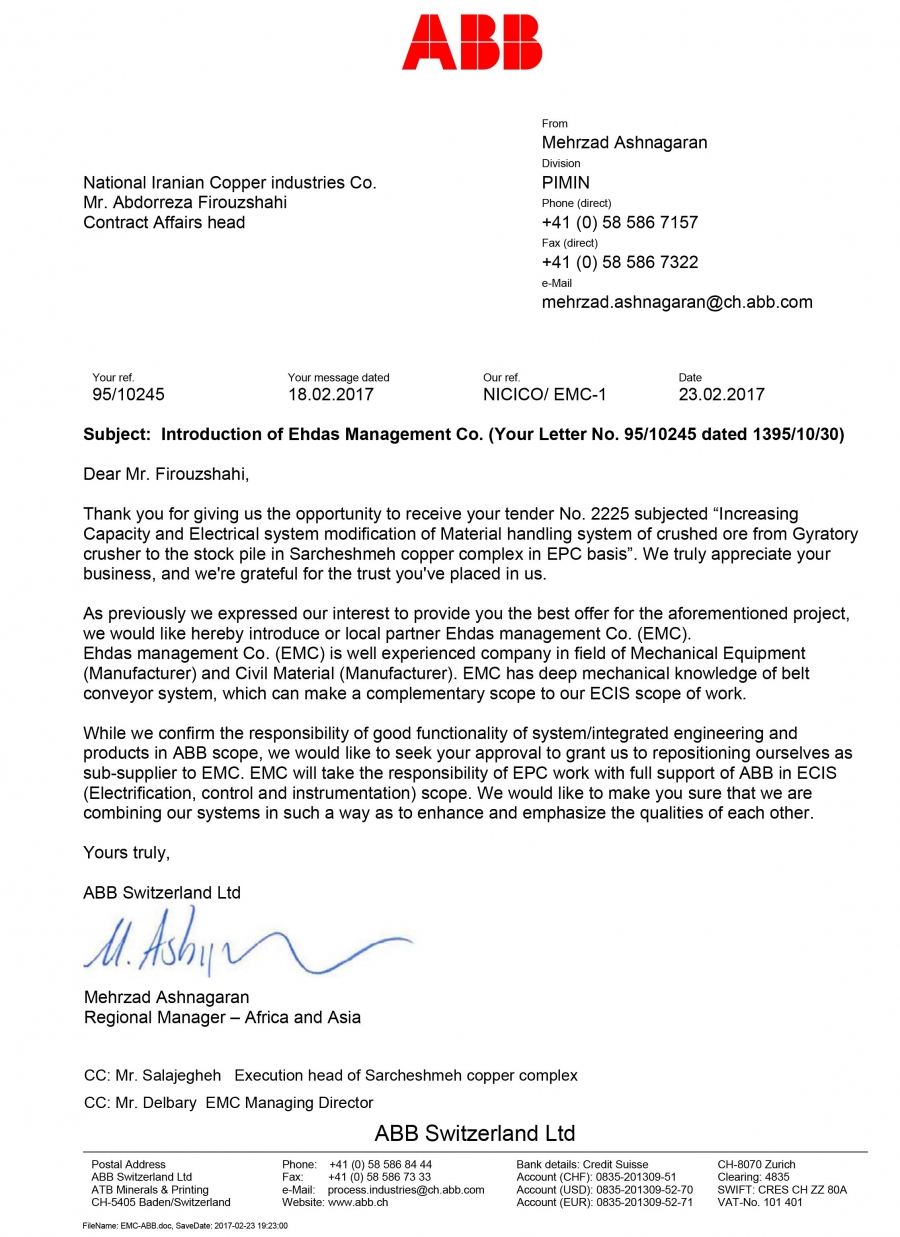 شرکت مدیریت احداث برای حضور در مناقصه افزایش ظرفیت سیستم انتقال مواد سنگ شکسته از سنگ شکن ژیراتوری به استوک پایل در مجتمع مس سرچشمه با شرکت ABB تفاهم نامه همکاری امضا کرده است مدیریت احداث به عنوان نماینده ABB در ایران مشغول به فعالیت می باشد.